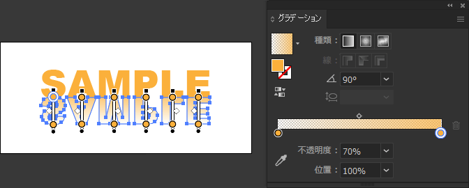 グラデーションパネルを開き、各項目を指定し、オブジェクトの選択を解除します。
